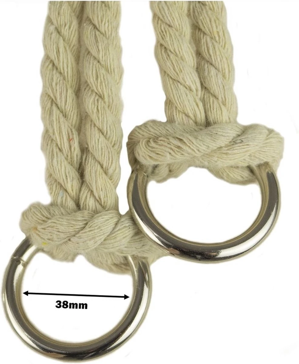 De slijtvaste katoenen touwen hebben aan de ene kant metalen ringen om op te hangen en decoratieve franjes aan de andere kant.