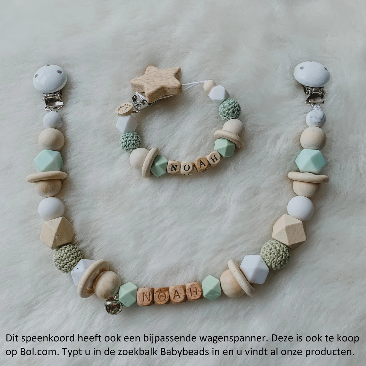 De houten letter kralen zijn gemaakt van onbewerkt beukenhout. Ze kunnen daarom verschillen in kleur. Dit maakt juist elk speenkoord uniek!