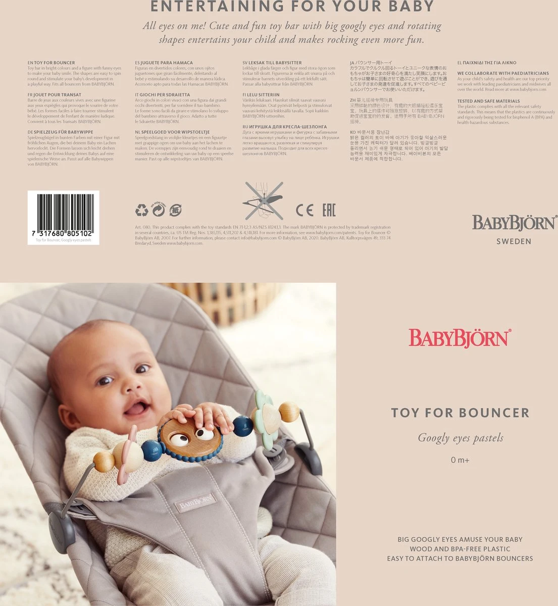 Je hoeft je geen zorgen te maken als je kind op het speelgoed zuigt. Alle plastic producten van BABYBJÖRN voldoen aan de geldende veiligheidseisen voor plastic in Europa en de VS. Dit betekent dat het plastic voortdurend streng wordt getest op bisfenol A (BPA) en voldoet aan de normen voor voedselveilige producten. Dat vinden wij belangrijk!