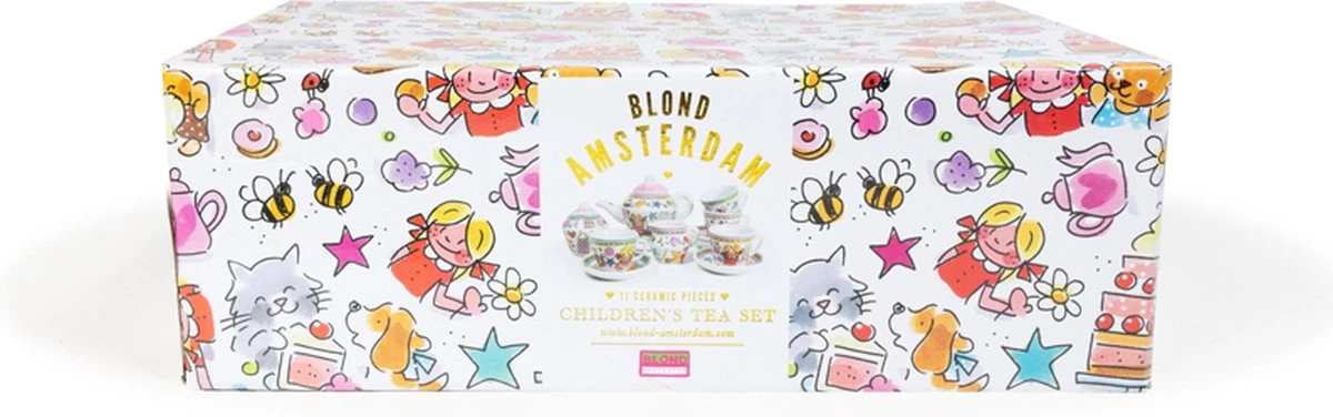 “Voor de kleinste Blond Amsterdamfans hebben wij leuk nieuws! In de collectie Even Bijkletsen hebben wij een 11-delig kinderservies ontworpen. Het servies bestaat uit 4 kop en schotels, suikerpotje, melkkannetje en theepot. Op de items staan vrolijke, kleurrijke kindertekeningen. Zo kunnen zij hun eigen theepartijtje houden!