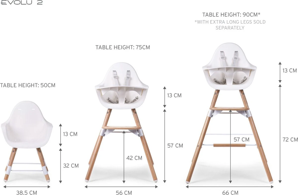 De Childwood Evolu 2-in-1 is een handige kinderstoel die je gemakkelijk aanschuift aan verschillende tafelhoogtes. De kinderstoel past aan een standaard eettafel van 75 cm, een kindertafel van 50 cm en met de (los verkrijgbare) lange poten ook aan een keukeneiland van 90 cm. Zo heb jij je kindje altijd dicht bij je.