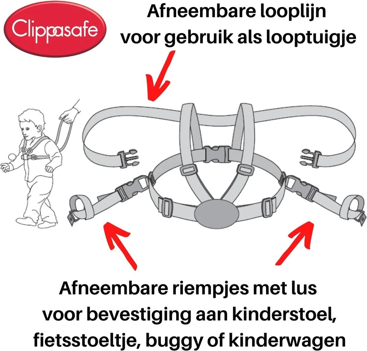 Dit Clippasafe kindertuigje is geschikt als looptuigje èn als kinderstoel tuigje. Je kunt de looplijn afkoppelen en verwisselen voor 2 bevestigingsriempjes. Deze riempjes kun je vastmaken aan een kinderstoel, fietsstoeltje, buggy of wandelwagen.