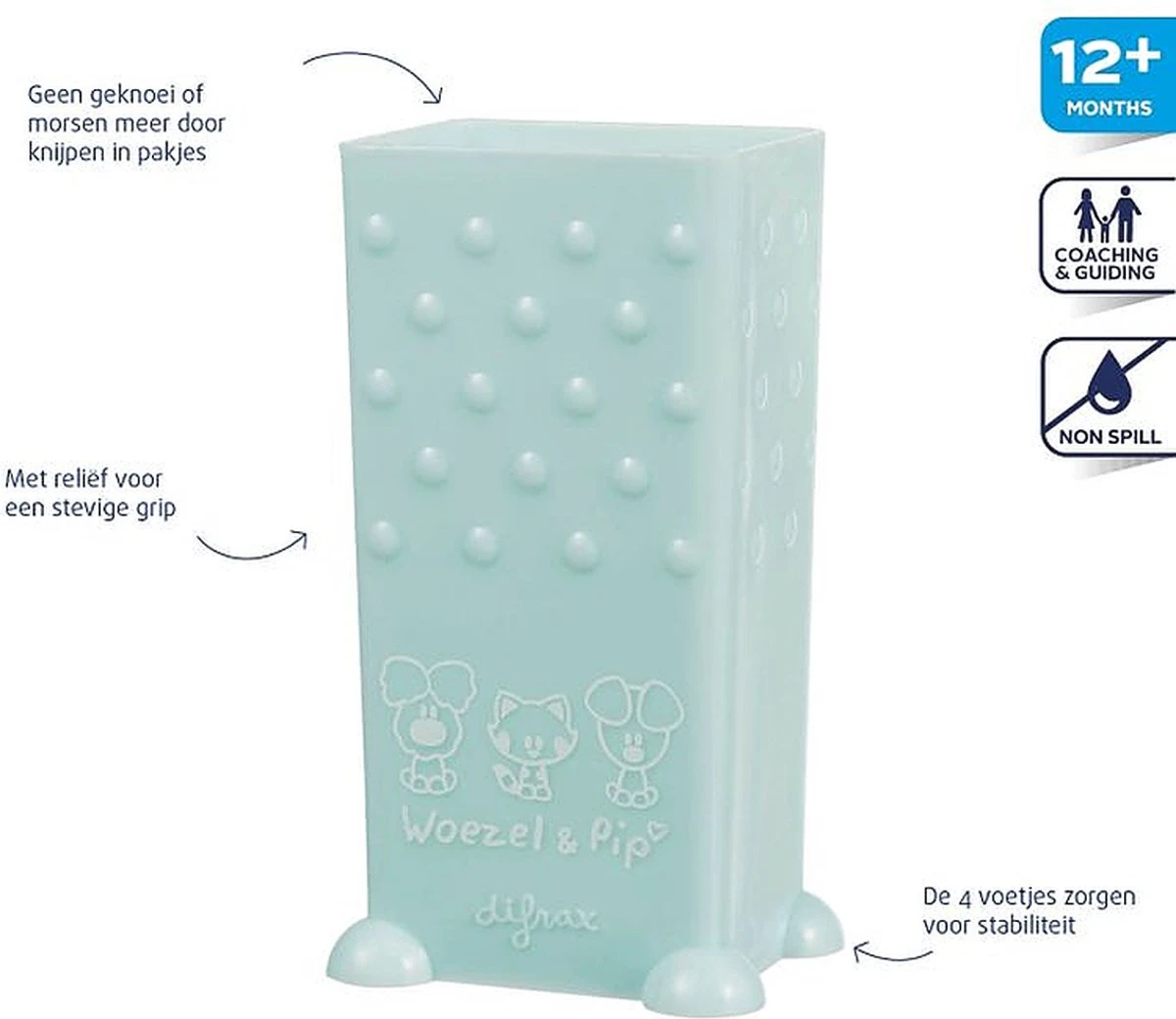 De stevige Woezel en Pip pakjeshouder voorkomt knoeien en morsen als gevolg van knijpen in sappakjes of brikjes. Ideaal als je peuter thuis of onderweg zelf uit pakjes wil drinken. Advies gebruik vanaf 12 maanden. Geschikt voor standaard pakjes (150 ml en 200 ml) in combinatie met langer rietje.