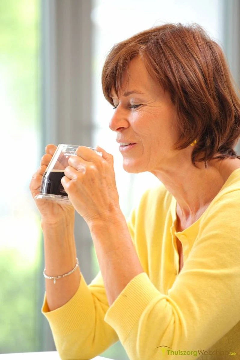 Ideale schuine, transparante beker met grote handgrepen. U kunt drinken zonder uw hoofd naar achteren te kantelen.