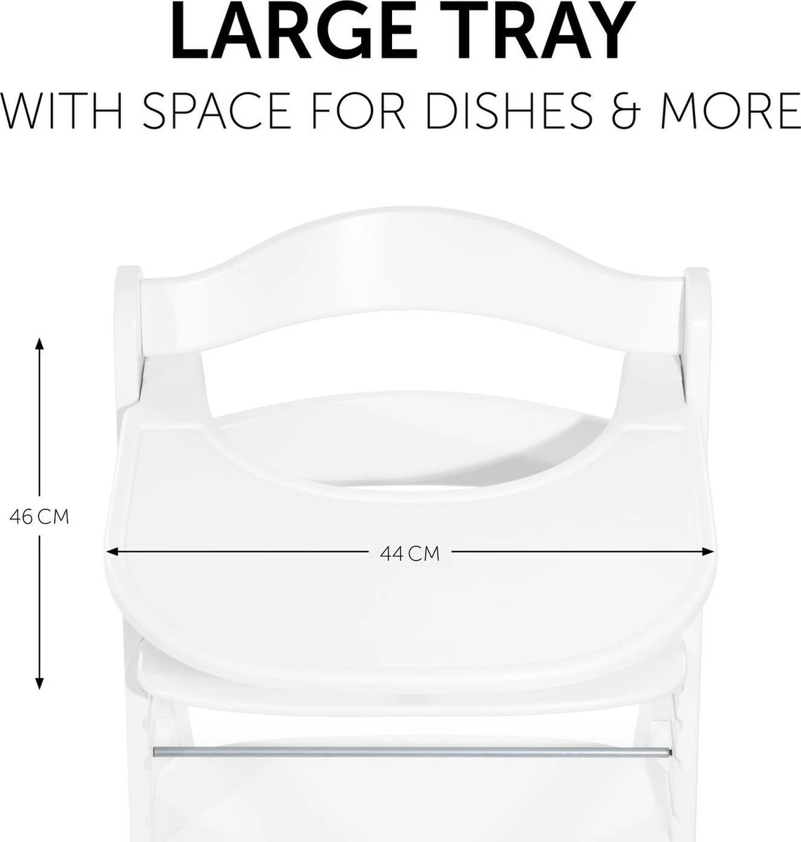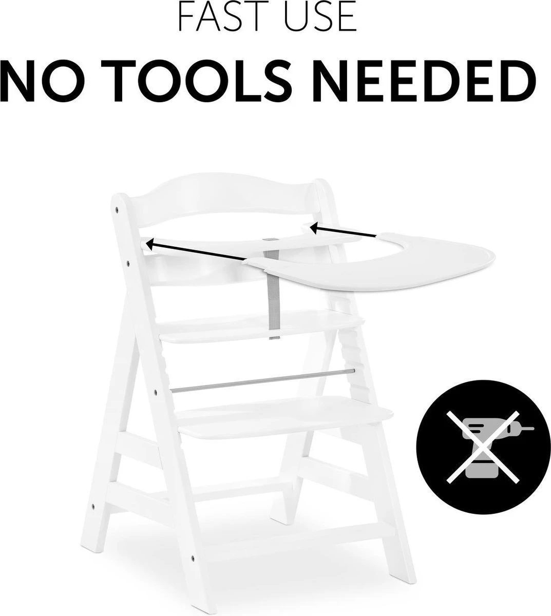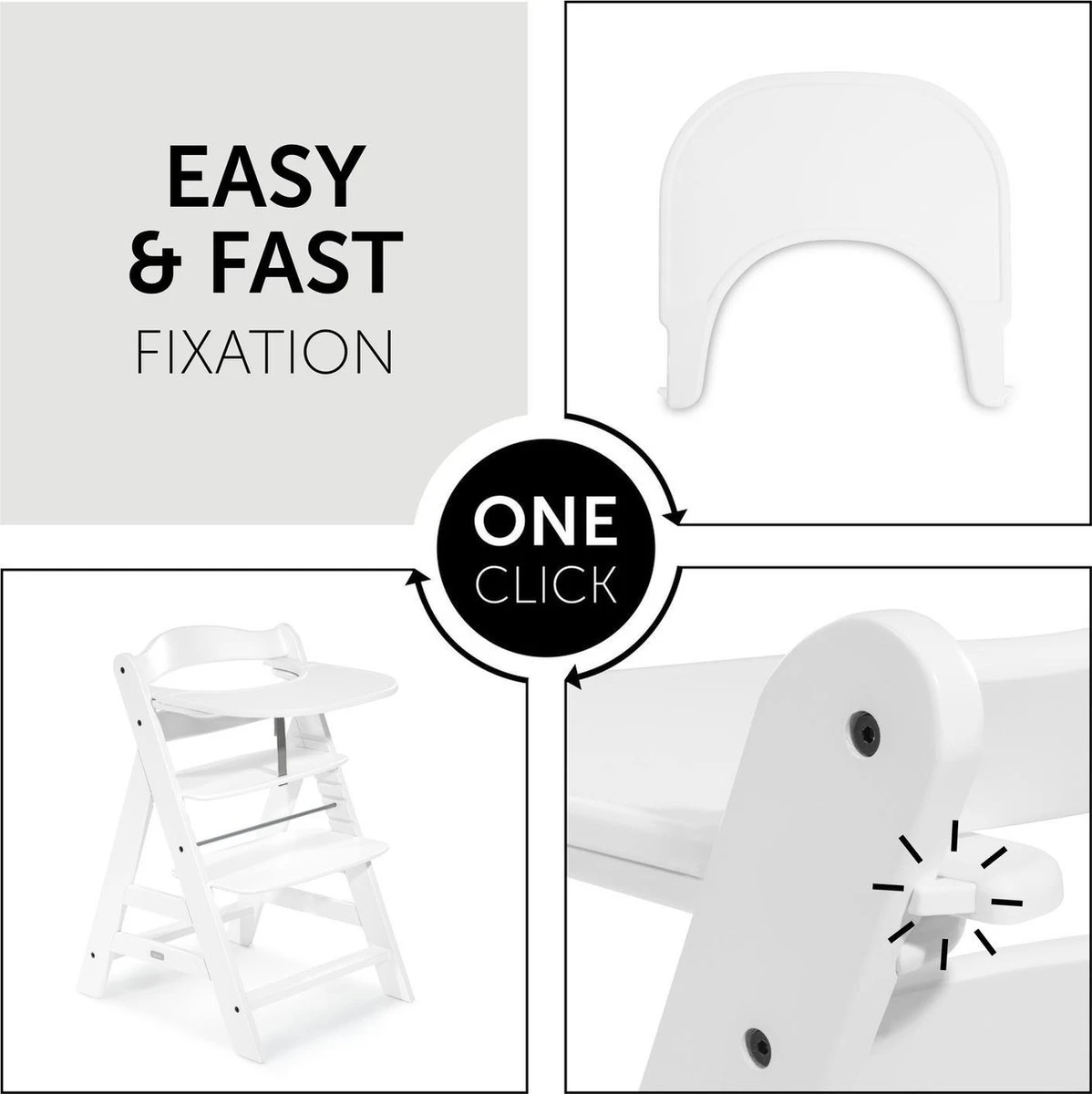 De Hauck Alpha Click Tray is een van de vele accessoires die verkrijgbaar zijn voor de Hauck Alpha+ houten kinderstoel. Dankzij het kliksysteem schuift het blad eenvoudig met één hand op de meegroeistoel en klikt veilig op zijn plaats – geen gereedschap nodig – voor maximale flexibiliteit tijdens de maaltijden.