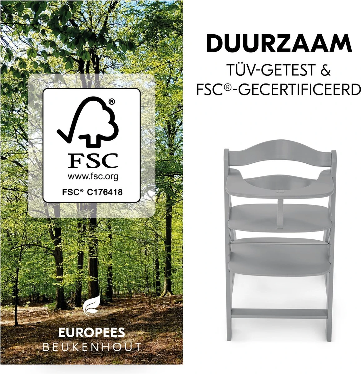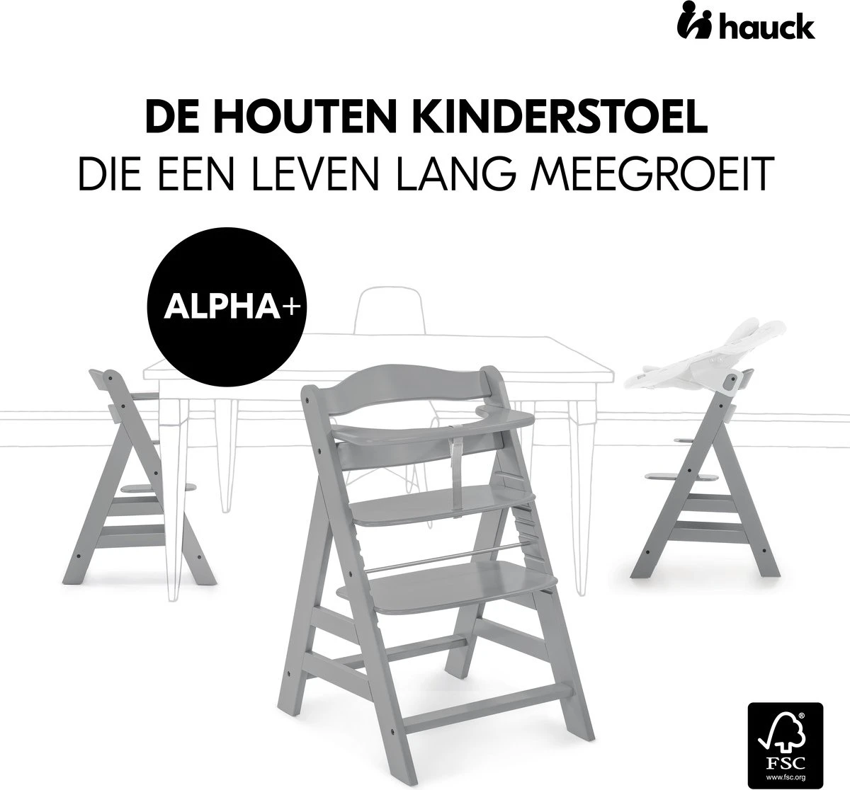 Hauck levert een bijdrage aan het beschermen van de natuur met deze houten meegroeistoel Alpha+. De houten meegroeistoel Alpha+ wordt geleverd inclusief voorbeugel, 5-puntsgordel en kruisbandje.