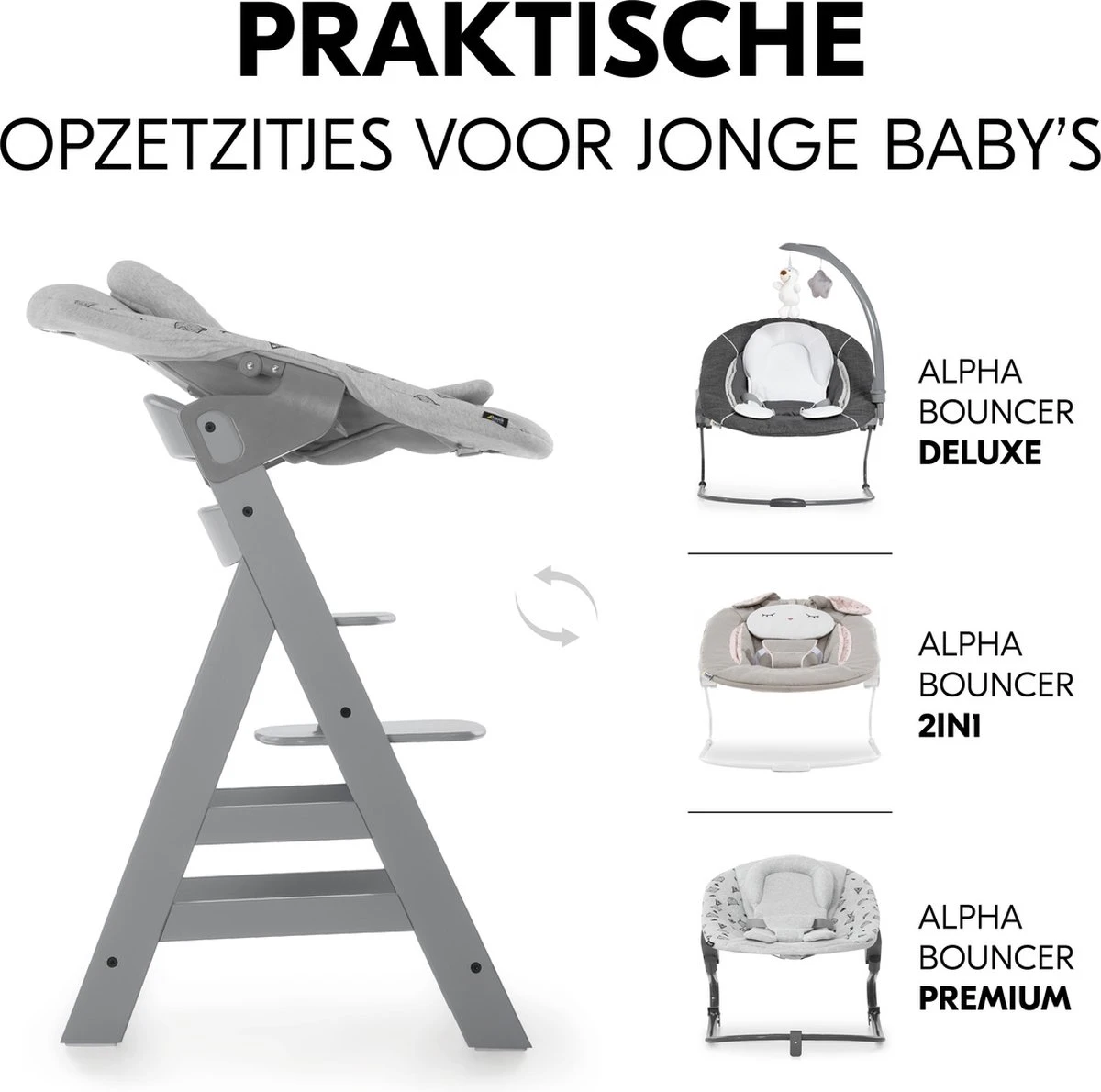 Aanschuiven aan tafel vanaf geboorte: In combinatie met de los verkrijgbare Hauck Alpa 2-in-1 Bouncer kun je deze kinderstoel al vanaf de geboorte gebruiken, in plaats van 6 maanden. Zo groeit deze meegroeistoel uit tot een tot een praktische metgezel voor het leven. Bekijk de Hauck Alpha 2-in-1 bouncer