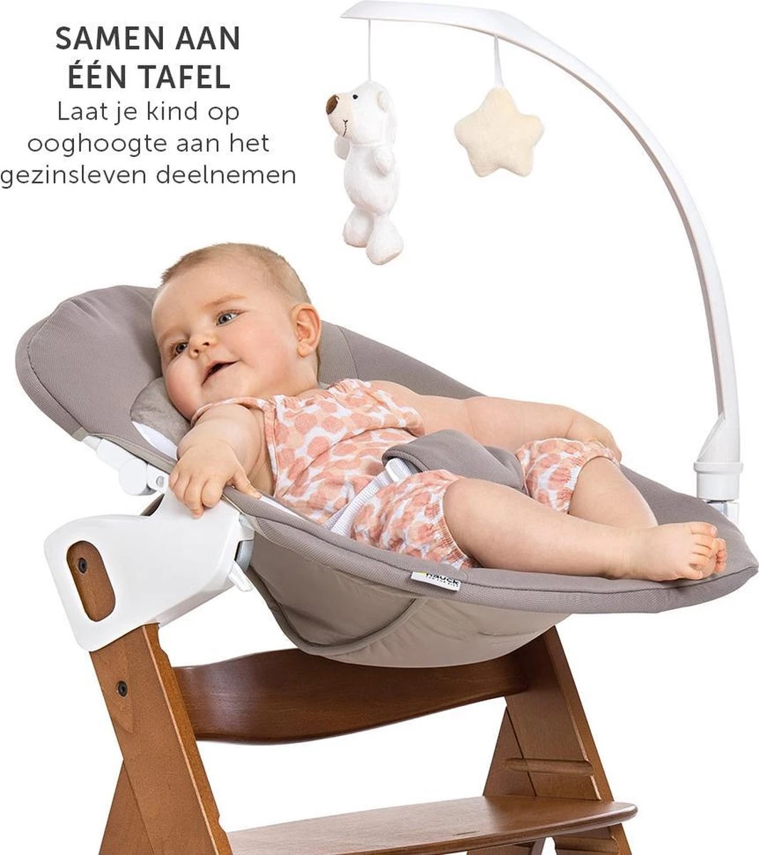 De duurzame 5 in 1 Hauck Alpha Plus Newborn Deluxe kinderstoelset is geschikt vanaf de geboorte tot 90 kilo en mag dus met recht een meegroeistoel genoemd worden. De zitting én de voetensteun kunnen op meerdere hoogtes ingesteld worden, dus altijd de perfecte hoogte voor de lengte van je kindje. Wat is er nou leuker dan met het hele gezin aan de eettafel zitten? Met de bijgeleverde bouncer met verstelbare rugleuning en speelmobiel zit ook je pasgeboren baby al gezellig bij je aan tafel. Deze kan ook los als wipstoeltje gebruikt worden.