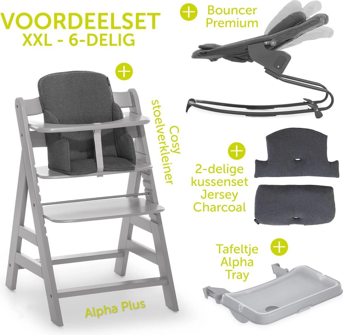 Completer gaat niet: Met de Hauck Alpha Plus Newborn Set XXL krijg je je kinderstoel met alle mogelijke accessoires inclusief: eettafeltje met afneembaar bovenblad (Alpha Tray), een echte stoelverkleiner, een kussenset, en natuurlijk de premium bouncer zodat je de meegroeistoel al vanaf de geboorte kunt gebruiken.