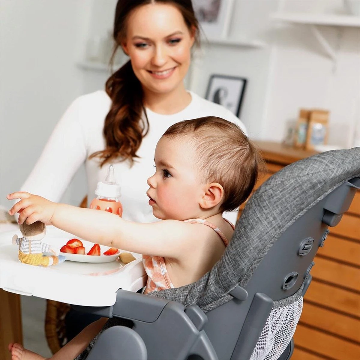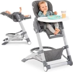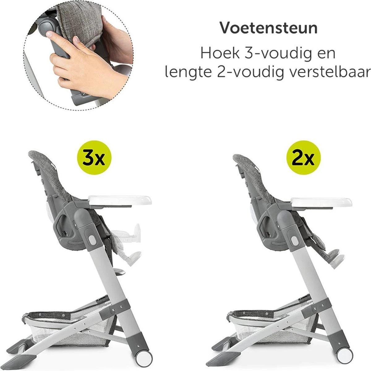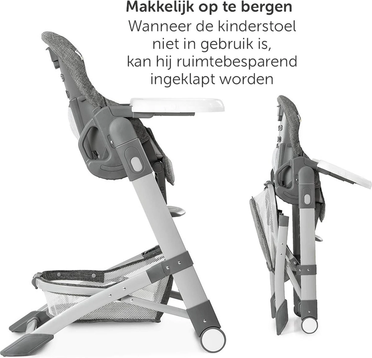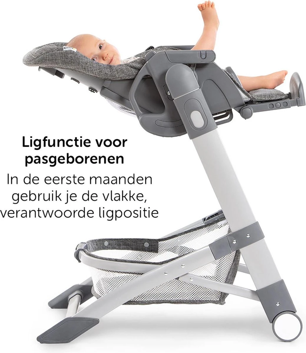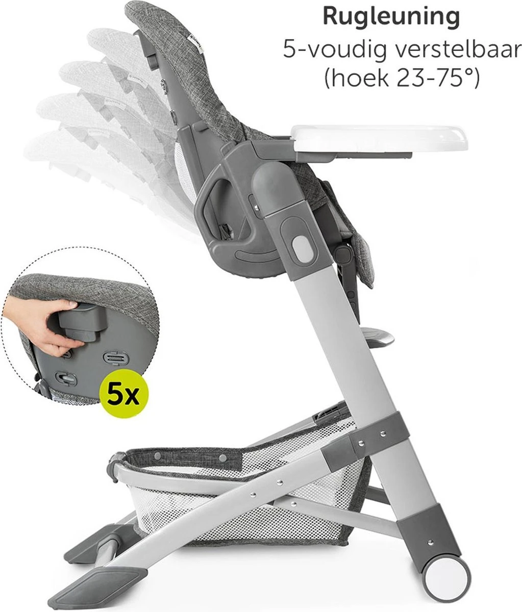 - 5 posities kantelbaar – De grijze kinderstoel heeft een verstelbare rugleuning, ideaal voor de eerste babyhapjes. Je baby kan dankzij de ligpositie vanaf de eerste dag gezellig met het gezin aan tafel gaan zitten.