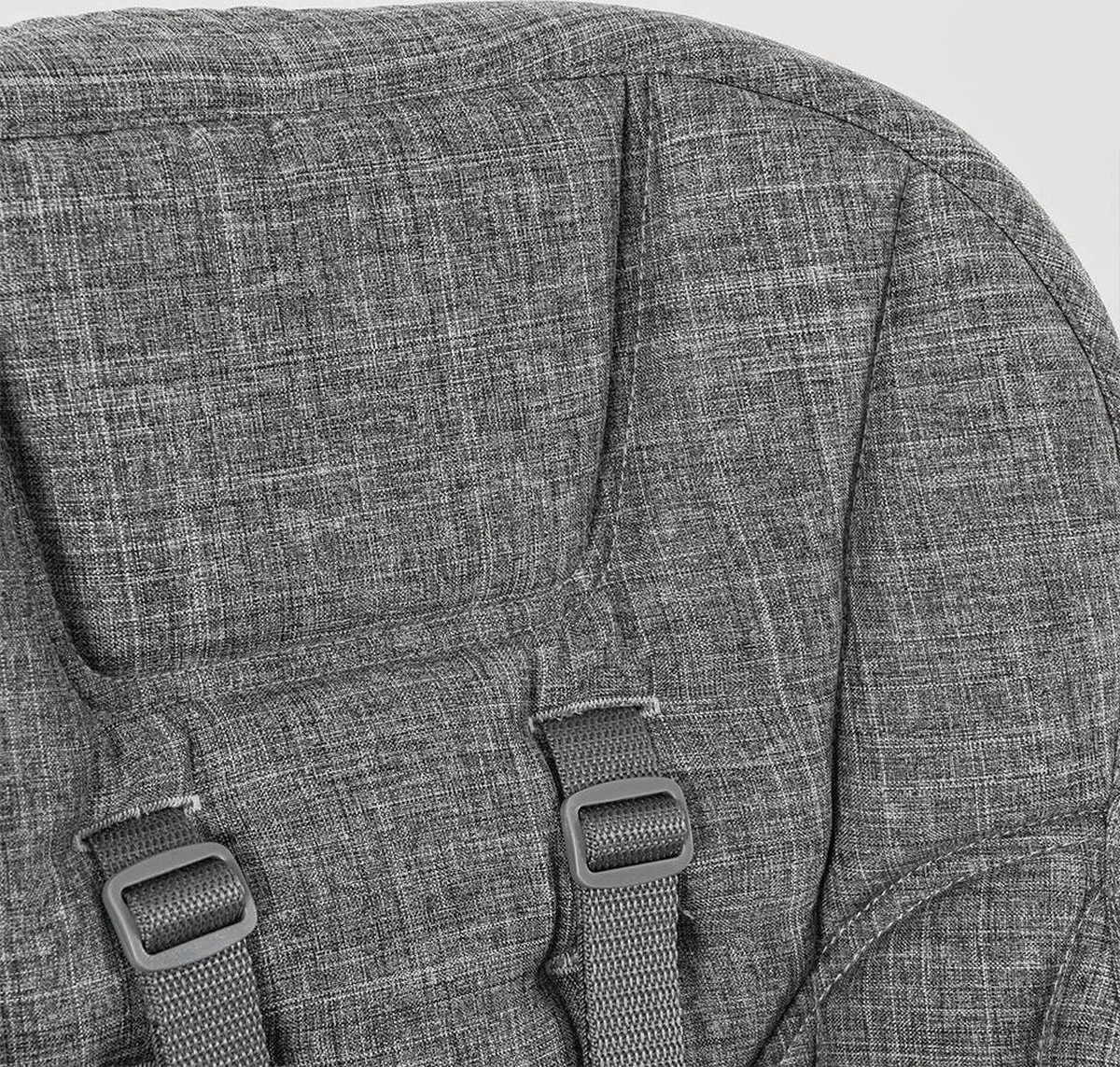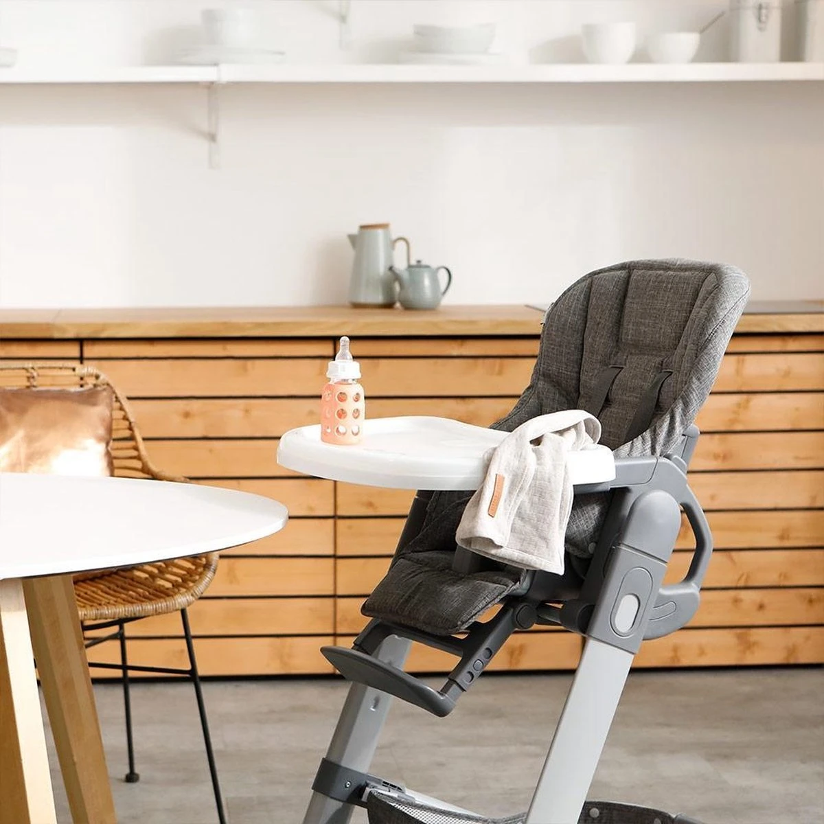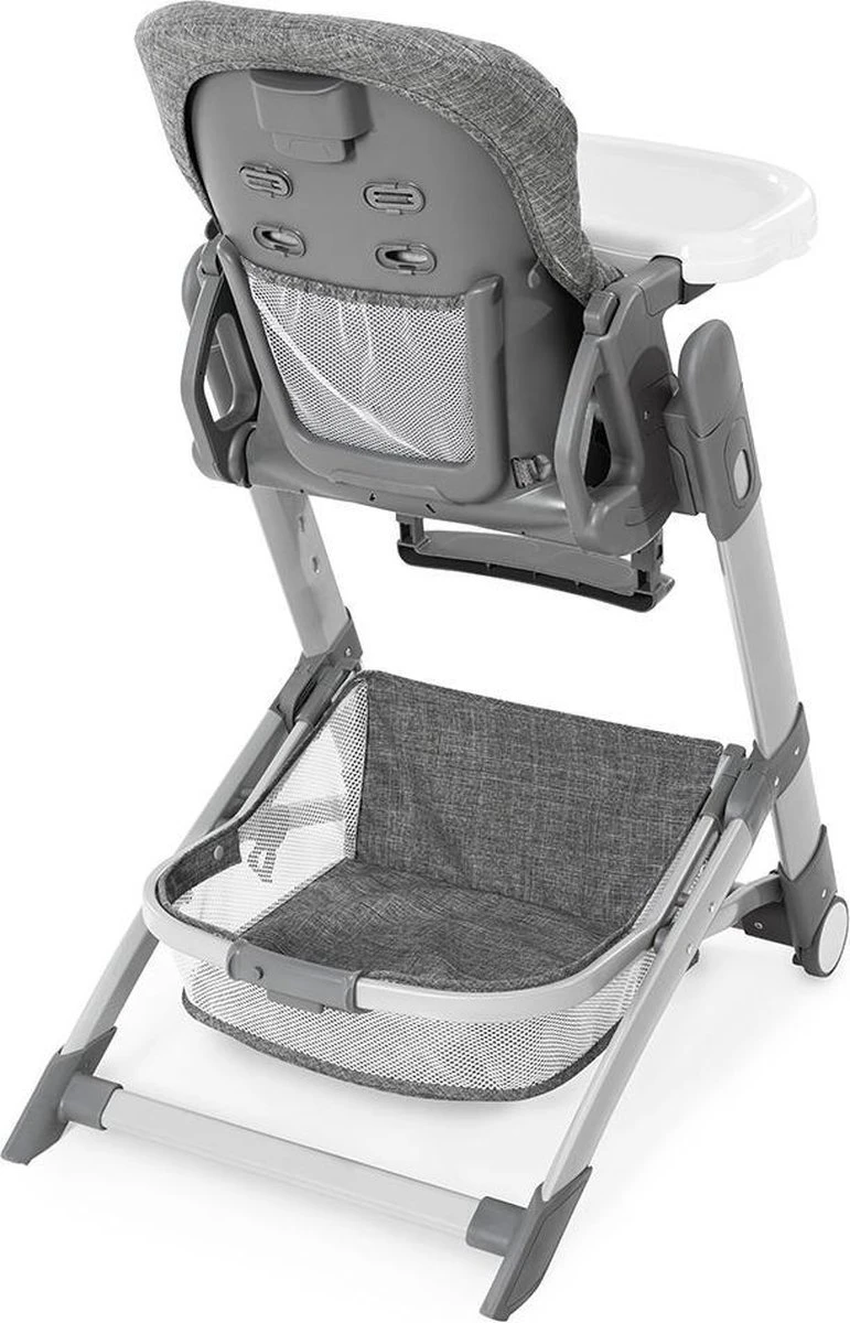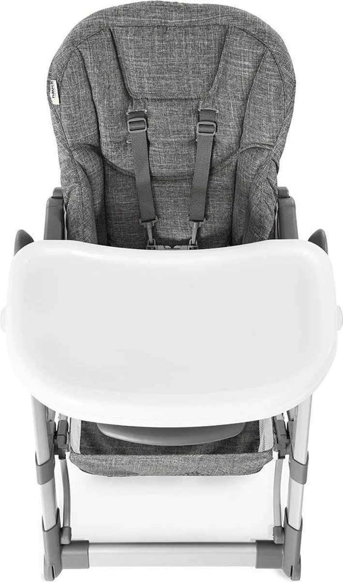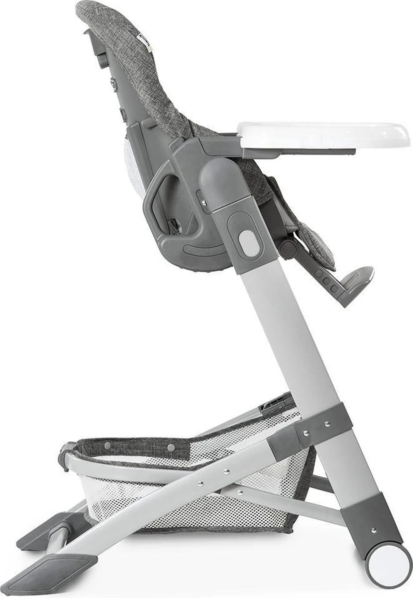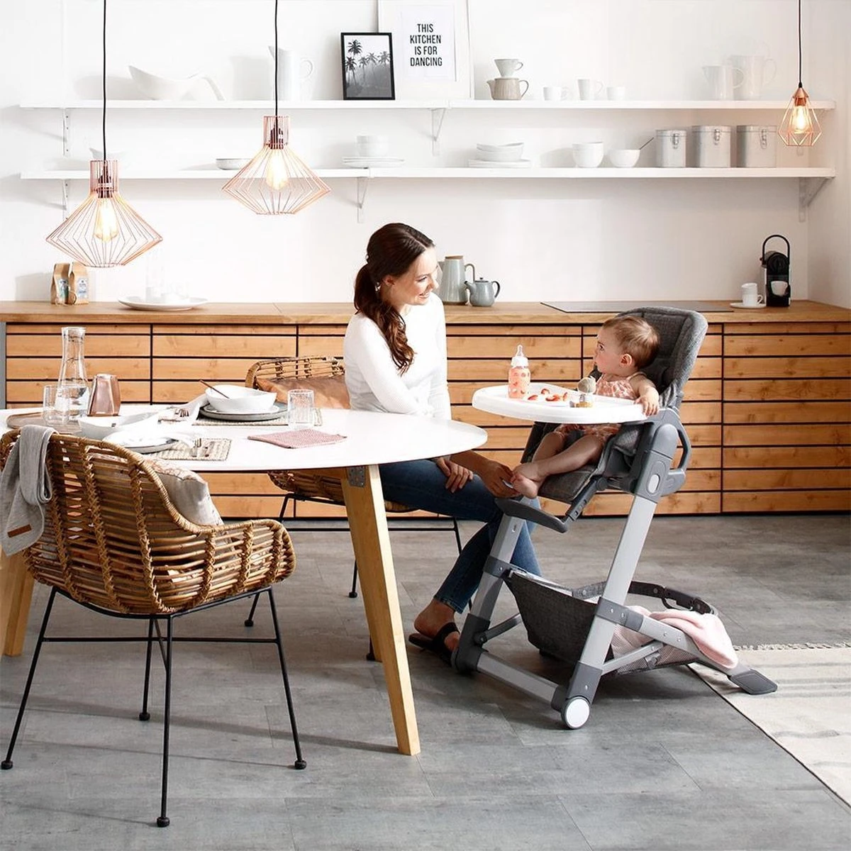 - 5 posities kantelbaar – De grijze kinderstoel heeft een verstelbare rugleuning, ideaal voor de eerste babyhapjes. Je baby kan dankzij de ligpositie vanaf de eerste dag gezellig met het gezin aan tafel gaan zitten.