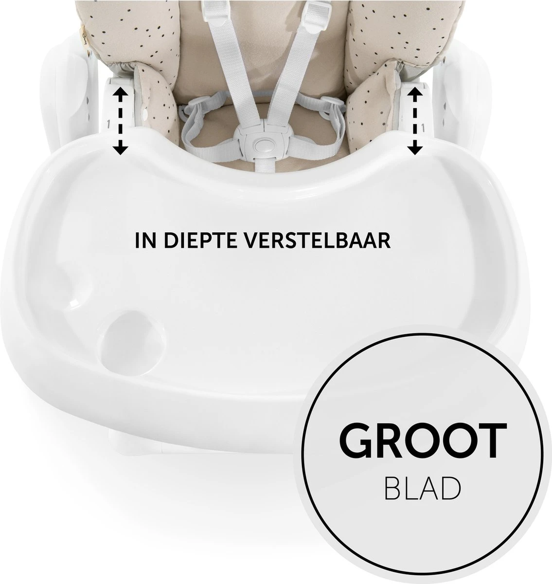 Het 5-punts harnas en de extra kunststof houder zorgen dat je kindje stevig in zijn stoeltje zit en samen met jou aan tafel eet. Je kunt het eet- en speelblad in diepte verstellen voor de ideale beenruimte. De handige uitsparing voor bekers houdt drankjes veilig en dankzij de verhoogde rand valt er niets van het blad. Zowel het eetblad als het speelblad kan probleemloos worden weggenomen zodat je het kunt schoonmaken.