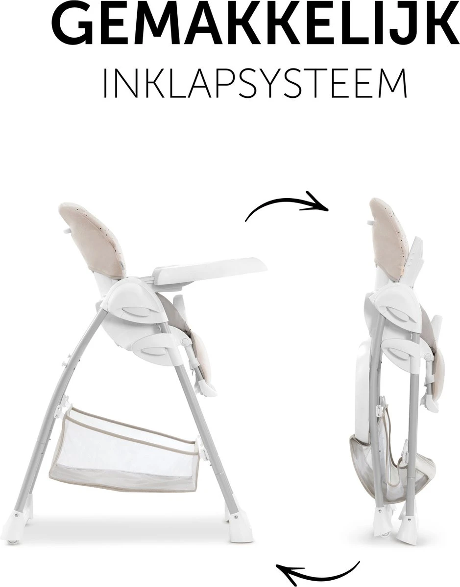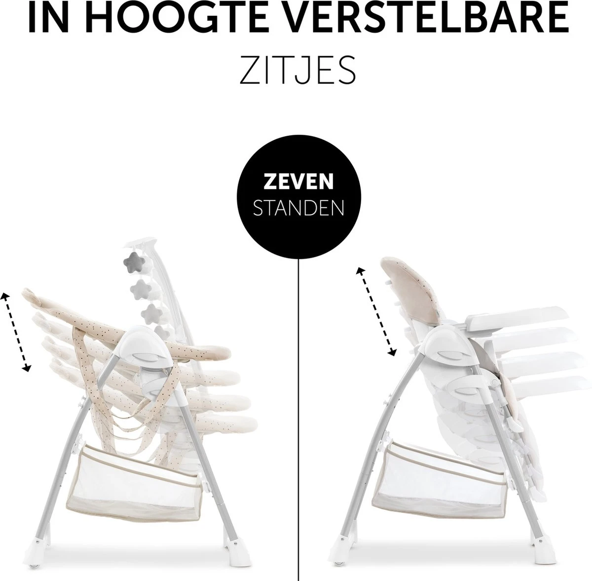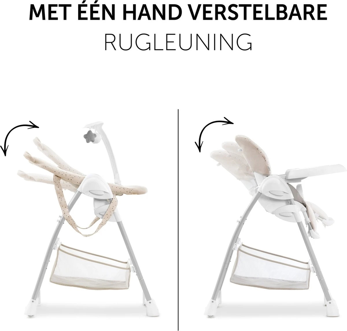 Het knusse babyzitje kan worden gebruikt vanaf de geboorte. Het maakt niet uit aan welke tafel je zit, dankzij de zeven verschillende hoogte-instellingen is je kindje altijd op ooghoogte en kan hij of zij alles meemaken. Je kunt de rugleuning van het babyzitje met één hand achterover zetten in ligstand. Op deze manier ligt je baby comfortabel. Een schattige mobiel stimuleert de ontwikkeling van de motoriek van je kindje. Je kunt de mobiel opzij draaien of helemaal wegnemen.