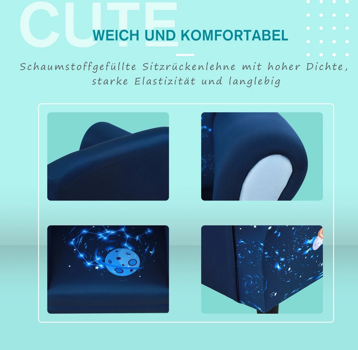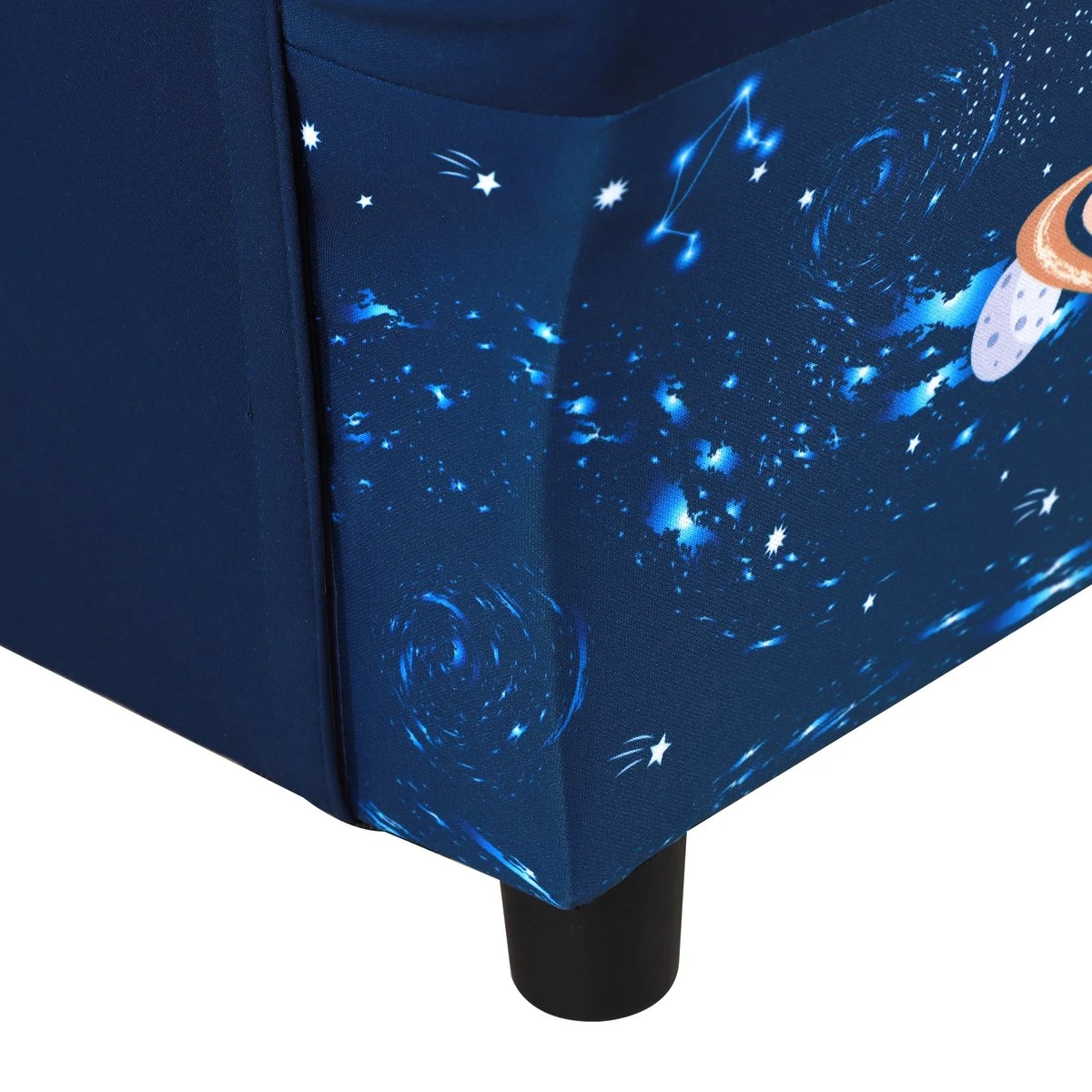 Onze kinderstoel met zijn schattige patroon is leuk, heeft een grote en comfortabele zitting en maakt je kind blij. De houten binnenstructuur zorgt voor stevigheid. Het maximale draagvermogen is 45 kg, aanbevolen voor kinderen van 3-6 jaar. Te gebruiken door kinderen. Kinderen zullen er dol op zijn! Eigenschappen: · Leuke patronen, geschikt voor kinderen die van het Heelal houden · Duurzaam polyester materiaal en zachte schuimvulling · Ideaal voor games, films, boeken, etc. · Massief houten structuur en draagsteun, maximale draagvermogen 45 kg · De hoogte van de leuning is vanaf de vloer gerekend 37,5 cm · Je dient de voetjes zelf te monteren Technische gegevens: · Kleur: Blauw · Materiaal: Polyester, hout, schuimstof, kunststof (poten) · Leeftijd: 3-6 jaar oud · Certificaat: EN71-1.2.3 · Afmetingen: 59,5 L x 43 B x 46,5 H cm · Zitgrootte: 31 L x 31 B x 20 H cm · Zithoogte: 20 cm Afmetingen poten kruk: ø5 x 5 H cm · Draagvermogen: 45 kg · Nettogewicht: 4,6 kg · Omvang van de levering: 1 x kinderbank · Verzendbriefje: Geen verzending naar Nederlandse eilanden.