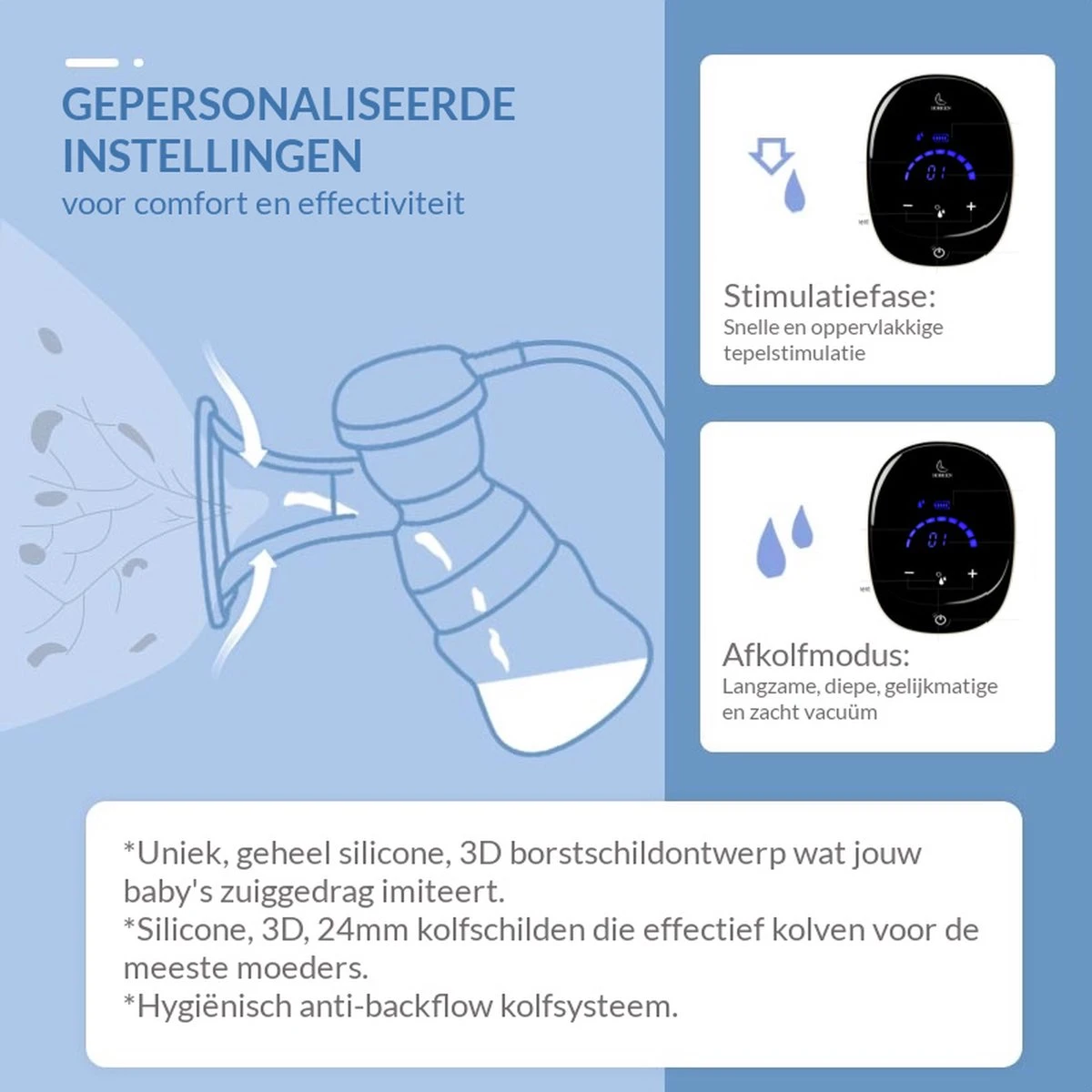 Uiteraard is Horigen Beature een 2-fasen systeem borstkolf. In de stimulatie-fase wordt met een snellere zuigcyclus de toeschietreflex opgewekt waarna je met een druk op de knop kunt overgaan (of automatisch na twee minuten) naar de afkolffase. De afkolffase heeft langzamere cyclus waarmee de melkstroom optimaal gestimuleerd wordt om de moedermelk uit de borst te halen. Op het touchscreen kun je in de zowel in de stimulatie-fase als afkolf-fase de vacuüm in 9 stappen aanpassen.