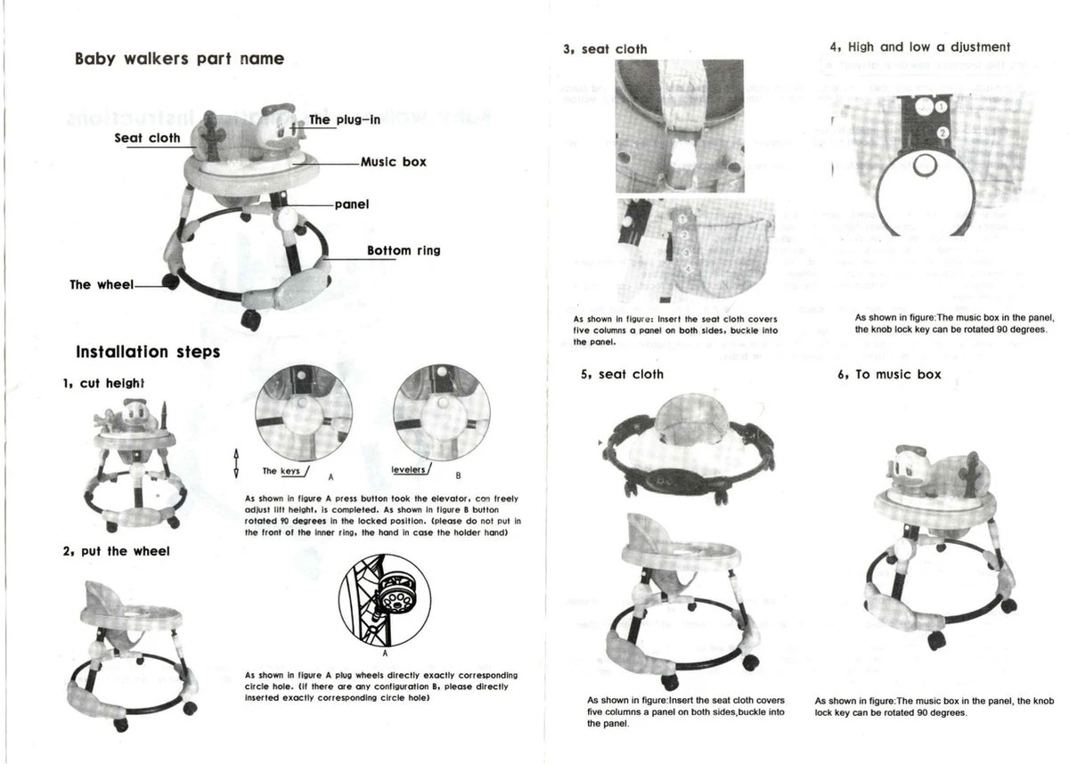 - De hoogte van de loopwagen moet worden aangepast aan de grootte van het kindje om ervoor te zorgen dat de voetjes van de baby de vloer volledig raken.