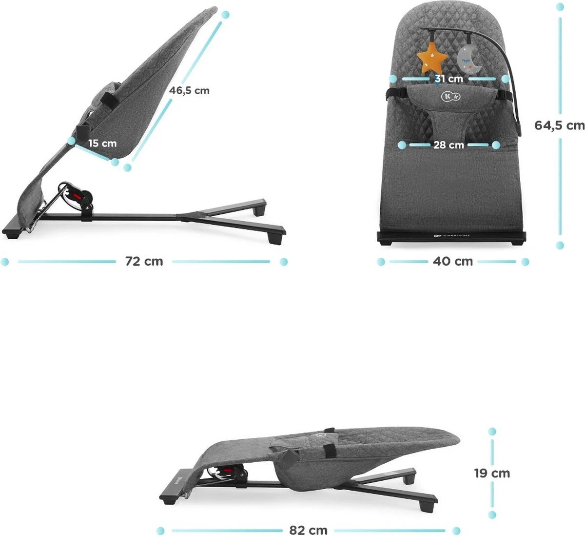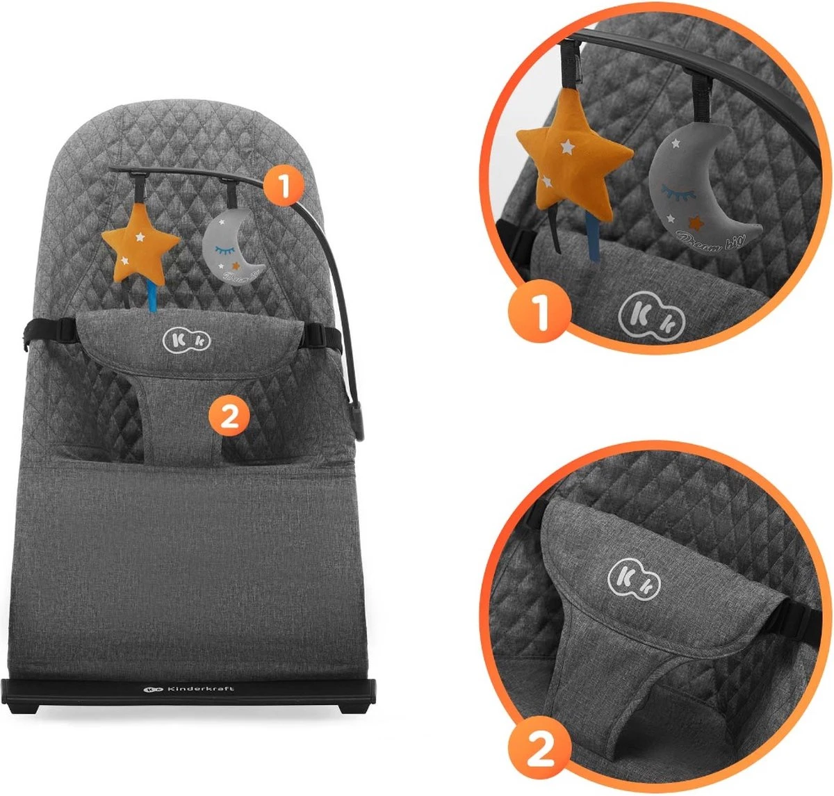 Het MIMI wipstoeltje is puur minimalisme in een mooie vorm. Het is veilig, comfortabel en chic in één. Het zal je baby helpen kalmeren, zelfs op zeer onrustige dagen omdat het niet veel prikkeling geeft. En als je kleintje wil spelen – zijn er 2 hangende speeltjes ter beschikking. Geen lichten of harde geluiden. Je kunt het gemakkelijk aanpassen aan de behoeften van je baby dankzij de rugleuning die in 3 niveaus verstelbaar is. De nauwsluitende zitting van aangename stof verdeelt het gewicht van het kind gelijkmatig en bevordert een natuurlijke rusthouding.