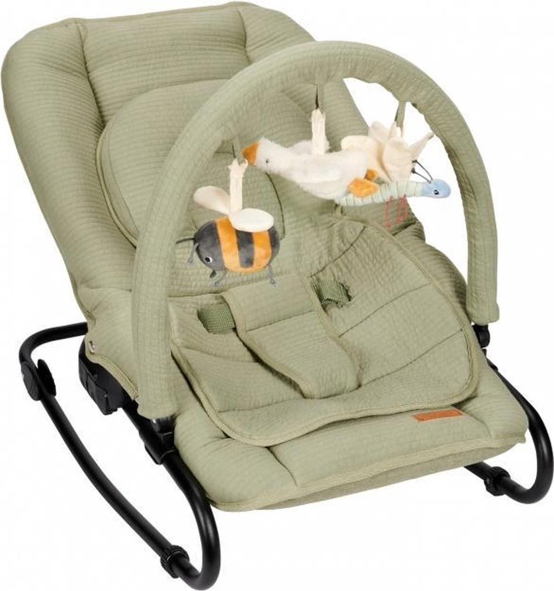 De wipstoel wordt geleverd inclusief speelboog met 3 leuke speeltjes van Little Dutch.