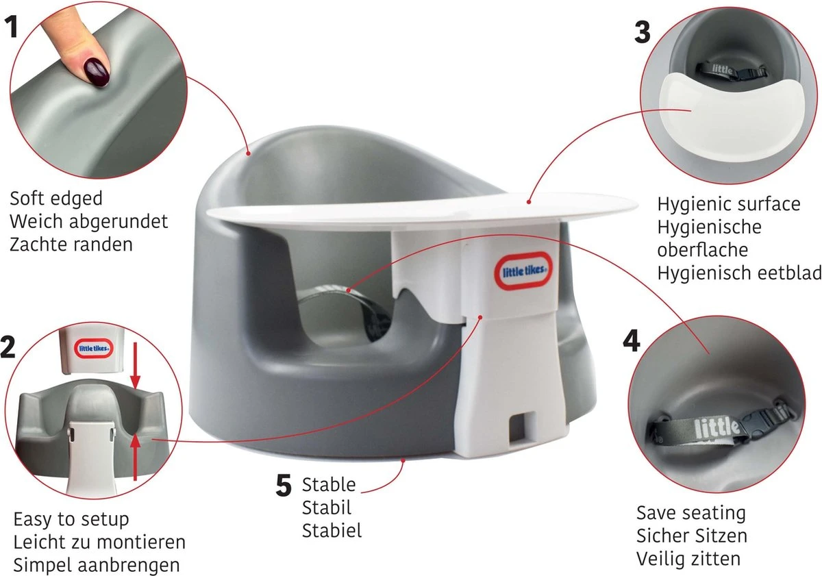 Deze Little Tikes Floor Seat Grijs is gemaakt voor baby’s vanaf 4 maanden en ouder. De Floor Seat geeft een comfortabele en veilige nek, rug, been en armondersteuning. Het is gemaakt van speciaal schuimstof dat stevig en tegelijkertijd zacht aanvoelt om een goede en comfortabele zithouding te creëren. Het zitje is lichtgewicht en daardoor gemakkelijk mee te nemen. Je kunt het zitje gebruiken om in te spelen, gewoonweg in de buurt te zitten terwijl jij je handen vrij hebt of om in te eten. Door middel van het afneembare tafeltje dat gratis bijgeleverd is gaat dit zeer gemakkelijk. Het zitje en tafeltje zijn gemakkelijk schoon te maken met een vochtige doek. Het ontwerp heeft ruim voldoende beenruimte, een hoge rug en een goede veiligheidsgordel. De brede basis zorgt voor een goede stabiliteit en voorkomt verschuiven en glijden op de gladdere vloer.
