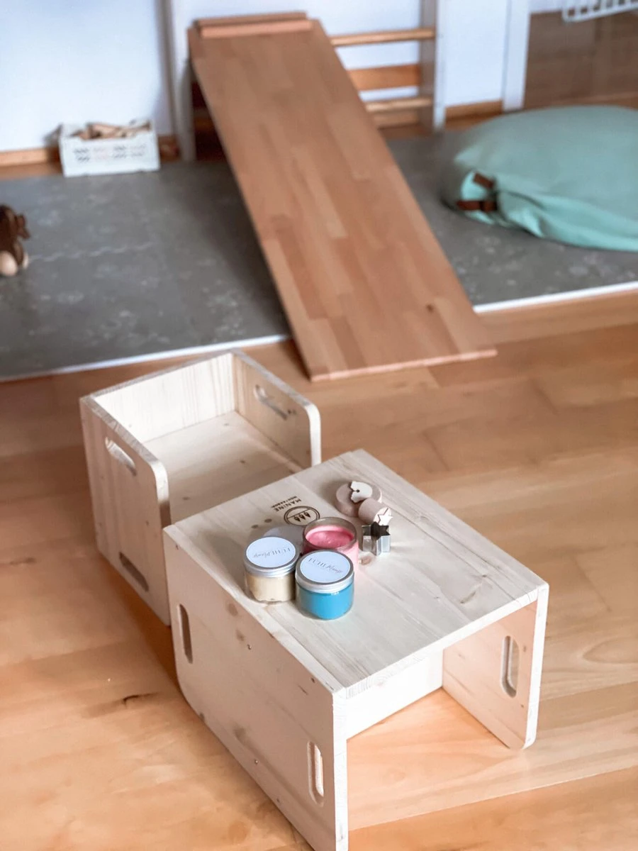 Op hun kan zijn de kubusstoeltjes een kleine tafel of nachttafel. Met de grote kubus als tafel en de kleine kubus als stoel heb je een complete set-up om je kleintje aan te laten eten en spelen.