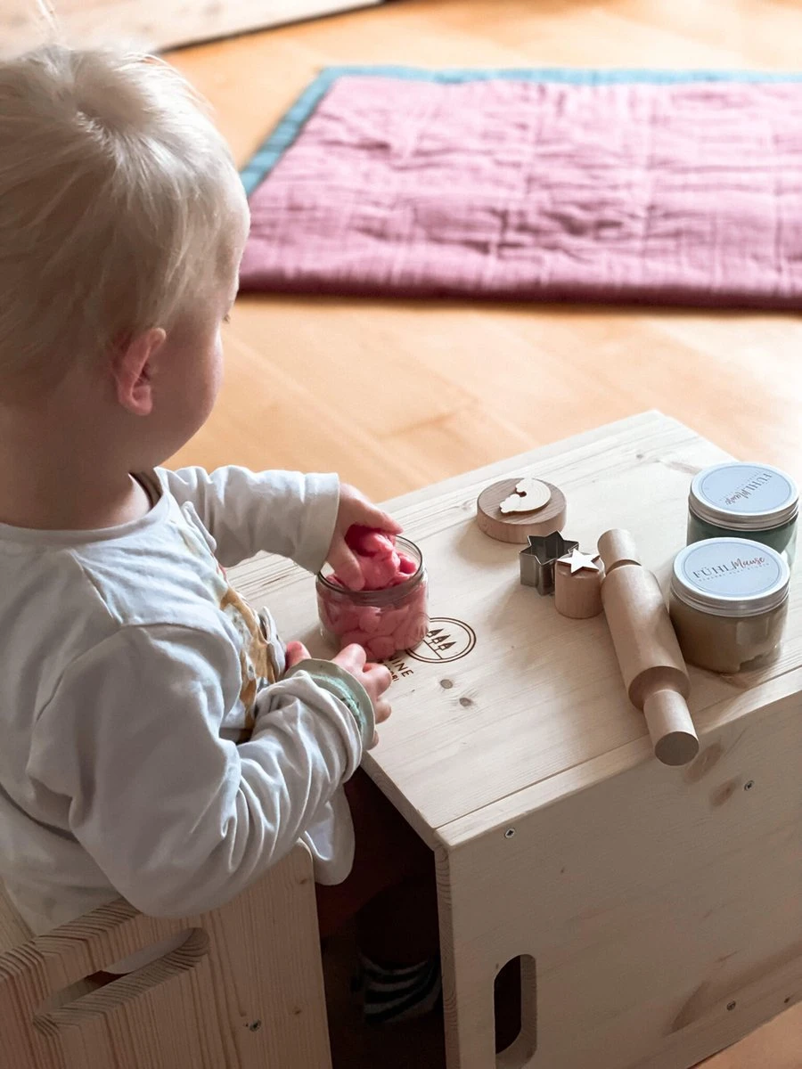 - We behandelen het hout niet met verven of vernissen, om niet nodeloos vluchtige chemische stoffen toe te voegen. Met onze Montessori meubelen hou je de kinderkamer puur en natuurlijk. Omdat dit meubel mogelijks in contact komt met water werd het behandeld met een onzichtbare wax die veilig is voor je kinderen.