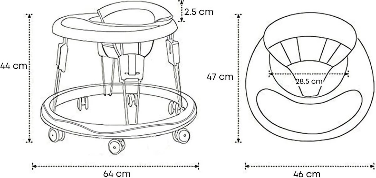 Onze babywalker is lichtgewicht en opvouwbaar met een ingeklapte hoogte van 4,5”, waardoor het gemakkelijk overal mee naartoe te nemen en moeiteloos op te bergen is, zelfs in de kofferbak van uw auto.