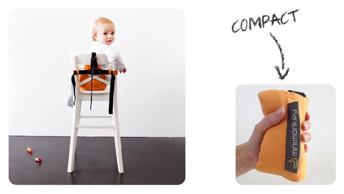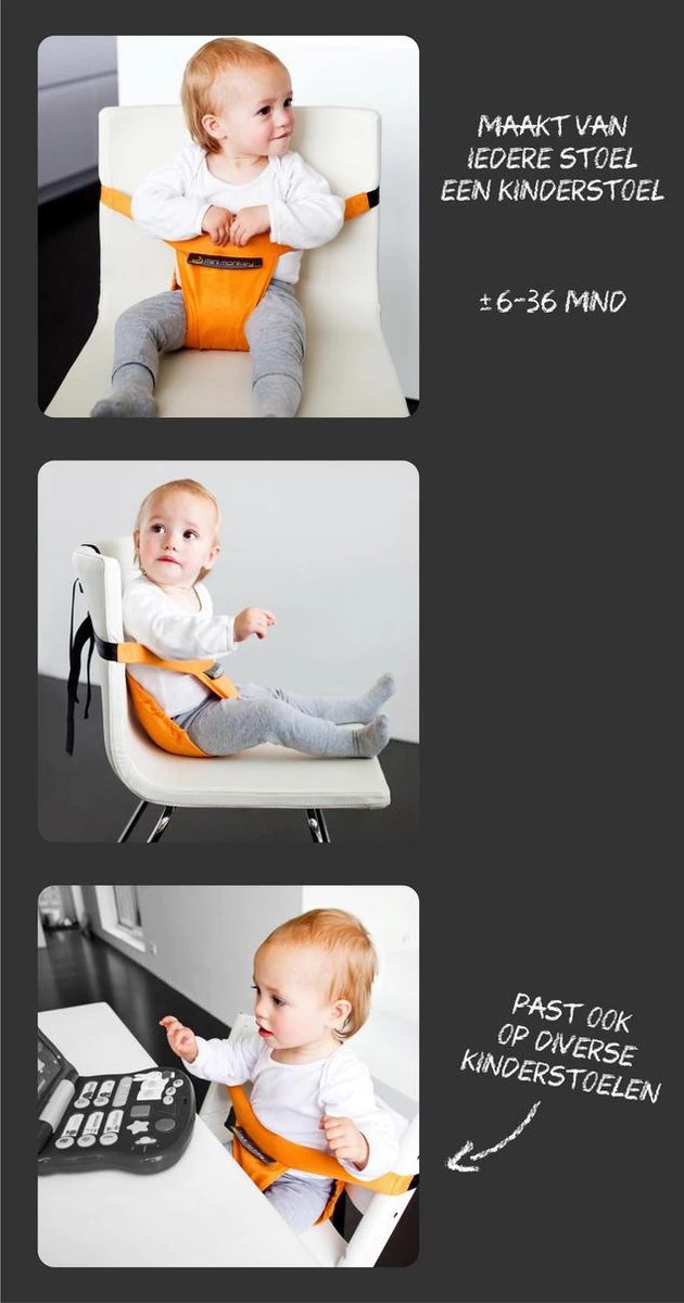 Minichair – maakt van iedere stoel een kinderstoel De minimonkey minichair is een soort ’tuigje’ waarmee je iedere stoel, dus ook een kinderstoel (bijv. de Tripp Trapp), kan omtoveren in een stabiel babyzitje. Daarnaast is het super makkelijk in gebruik; je legt het tuigje over een stoel, zet de baby erin, klikt de 3-punts gesp vast, trekt de banden aan en klaar! Door de compactheid (niet groter dan een luiertje) is het typisch een product dat je altijd meedraagt in je luiertas. Je kunt hem gebruiken vanaf het moment dat het kind uit zichzelf rechtop kan blijven zitten ( ± 6 maanden). Hij is gemaakt van 100% katoen en kan gewassen worden in de wasmachine Technische details -> De minichair heeft een ingenieuze gepatenteerde constructie met 3 verstelbare banden die aan de achterkant van de stoel samenkomen in een 3-punts gesp. Met de twee horizontale banden zet je de baby vast en de verticale band, die door de beentjes naar achter over de stoel loopt, kan je zo aantrekken dat de baby als het ware rechtop gezet wordt en niet onderuit zakt.