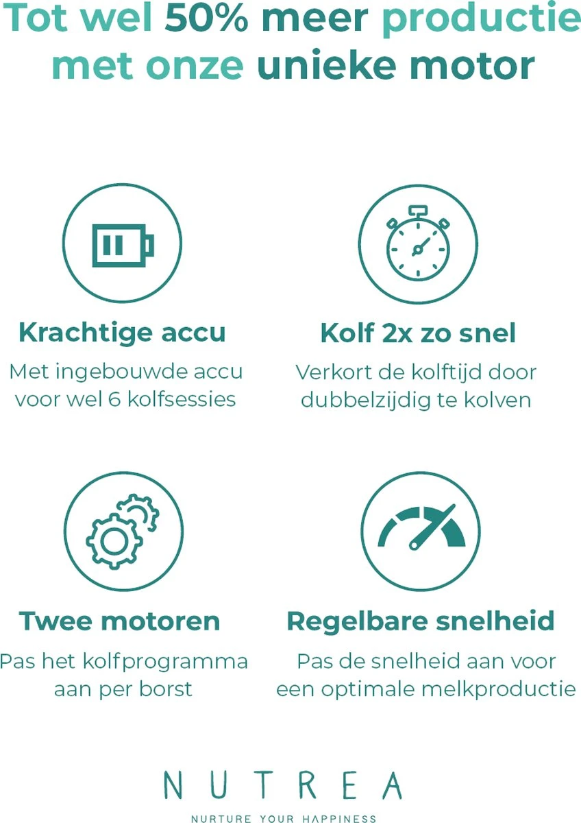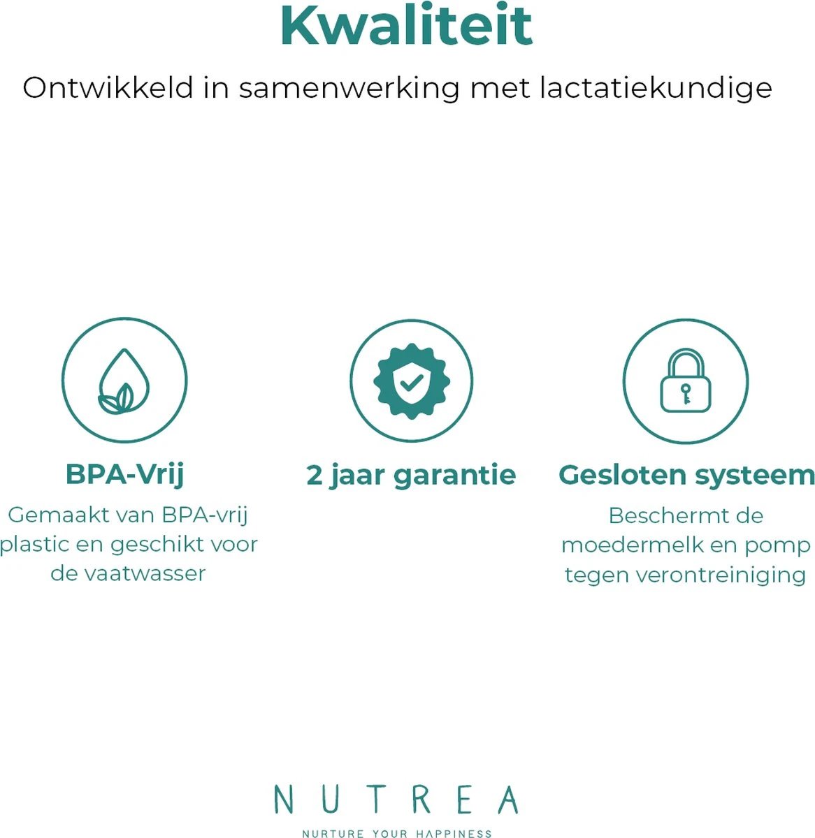 Wij bieden 24 maanden garantie op het pompmechanisme (aansturingsmodule) en 90 dagen garantie op de afwasbare onderdelen vanaf de oorspronkelijke aankoopdatum. Defecten die ontdekt worden binnen de garantieperiode, moeten worden gemeld aan Nutrea via de klantenservice. Nutrea behoudt zich het recht voor om de oorzaak van het defect te achterhalen om te bepalen of het binnen de garantie valt.