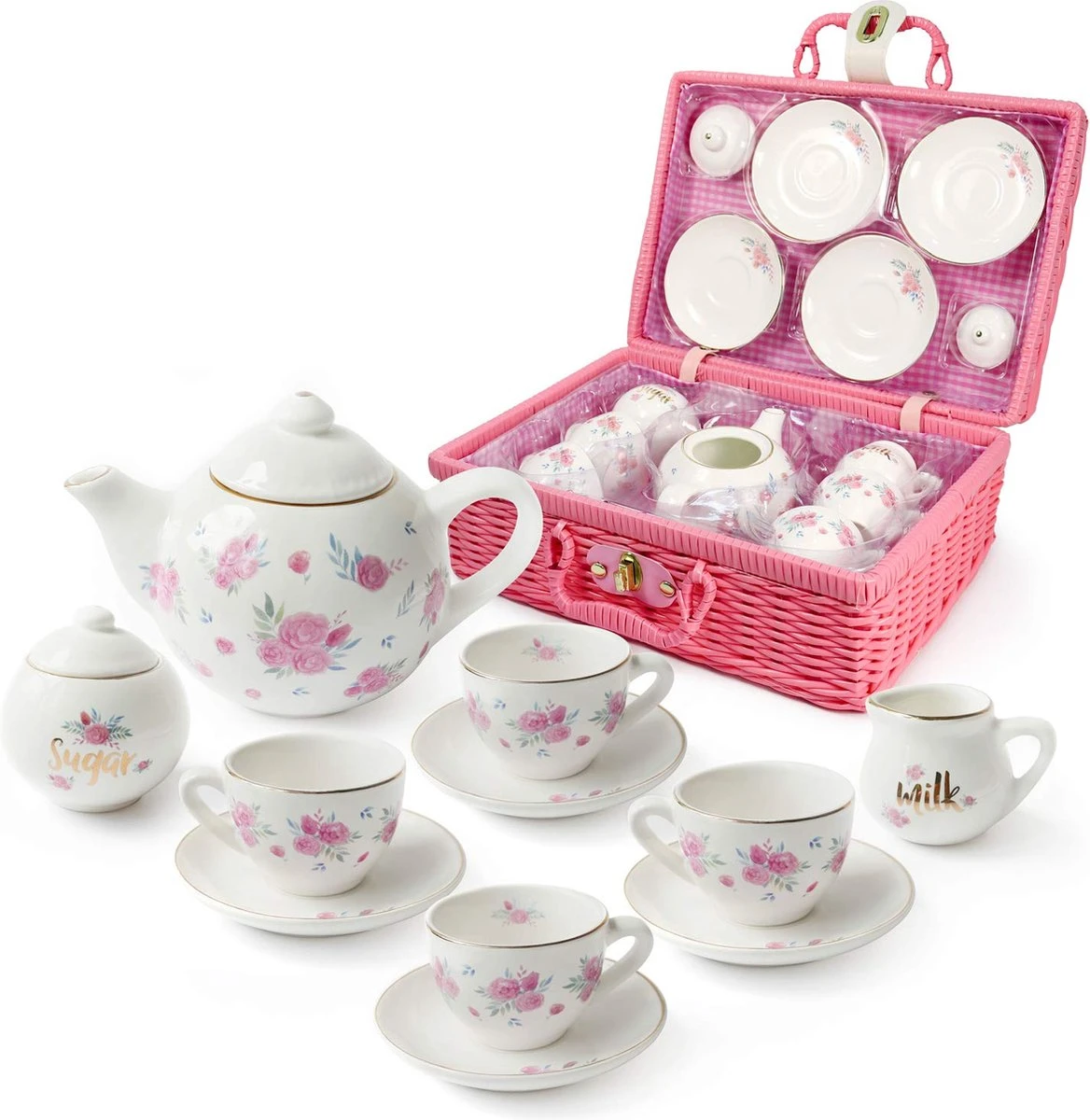 - Echt porselein – Elk stuk fijn servies is met de hand geglazuurd van echt porselein met een prachtig bloemendesign dat doet denken aan klassieke Engelse theeserviezen. Het theeservies voor meisjes bevat: 4 schotels, 4 theekopjes, theepot met deksel, creamer, suikerpot en een mooie roze rieten picknickmand.