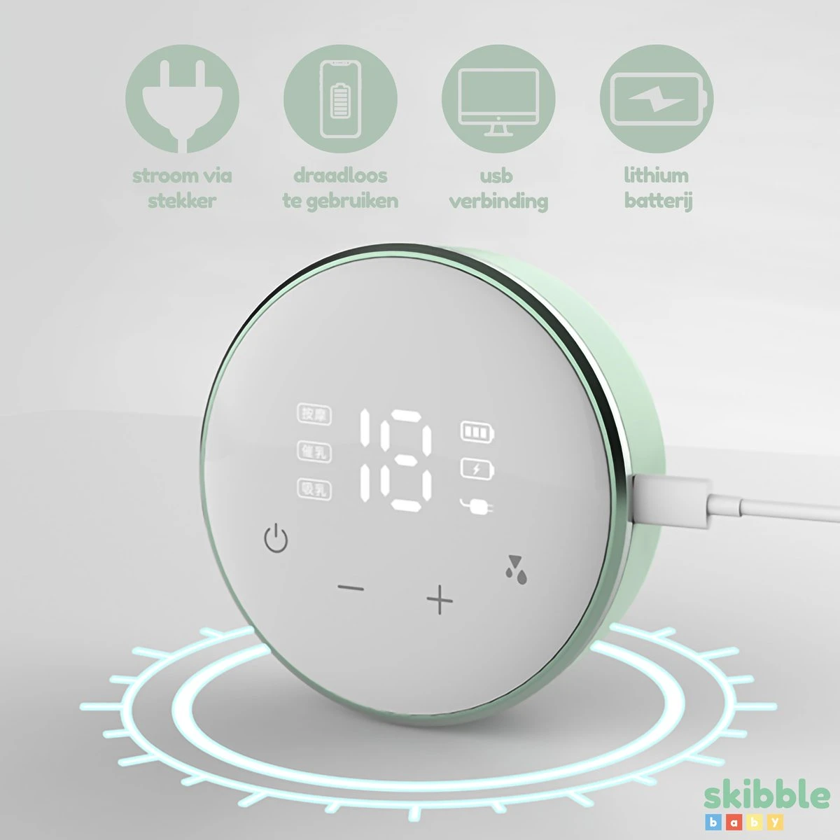 De borstkolf van Skibble Baby is bijzonder stil, minder dan 50 Decibel, USB-oplaadbaar en klein zodat je deze gemakkelijk kan meenemen en overal kan opladen en gebruiken, zo kun je altijd en overal kolven. De borstkolf heeft daarnaast een comfortabel siliconen borstschild van 9cm diameter welke op iedere borst passend is. Dit is een enkele borstkolf welke als voordeel heeft dat je per borst tijdens het kolven de standen in kan stellen. Wat voor de ene borst een prettige stand is hoeft voor de andere borst niet zo te zijn!
