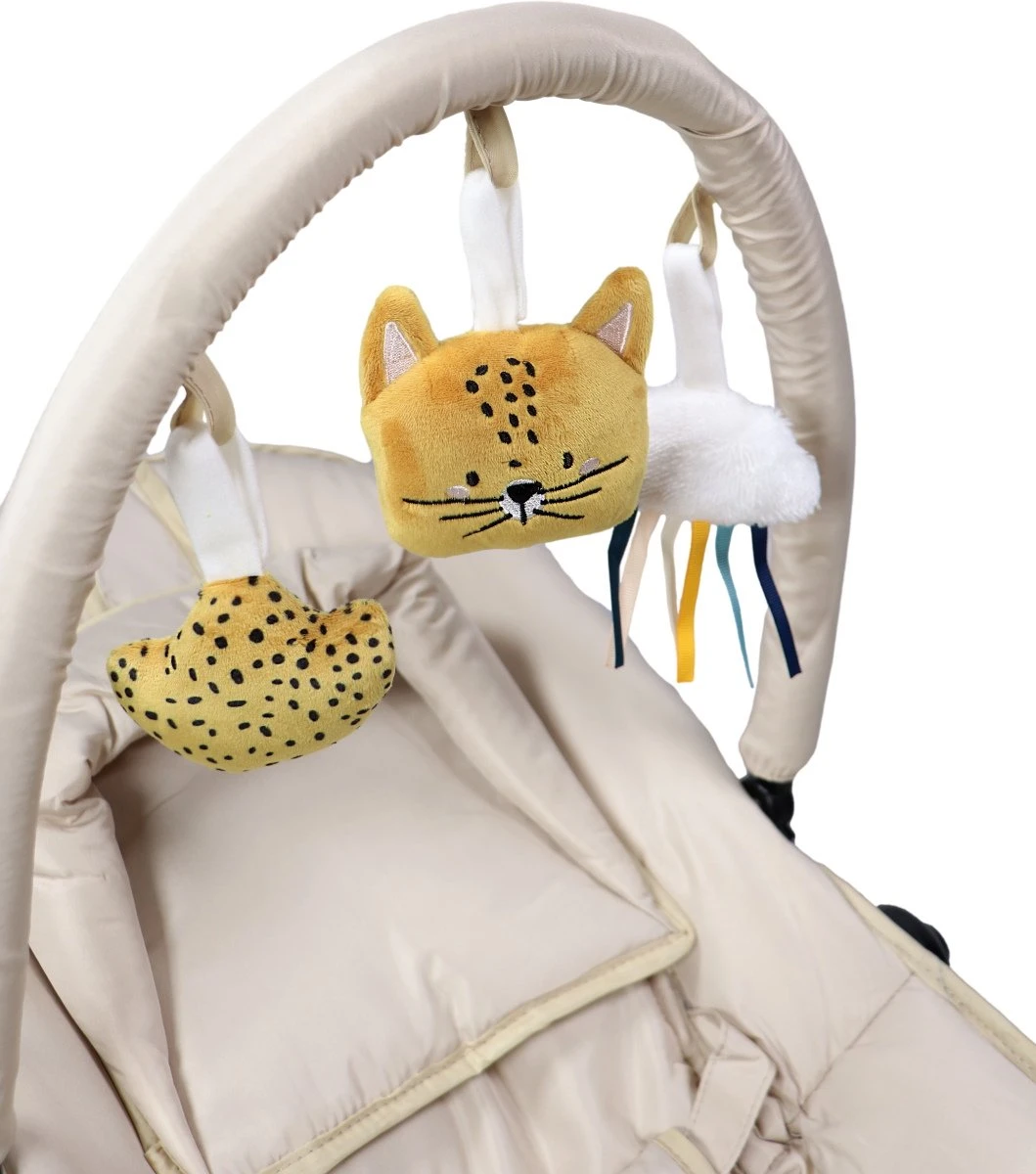 Je kindje hoeft zich niet te vervelen in de wipstoel, hij heeft namelijk een vrolijke (afneembare) speelboog met drie leuke speeltjes en Leopard Lenny in de hoofdrol! De wipstoel heeft een schommelfunctie maar ook twee haakjes waarmee je hem vast kunt zetten, handig als je bijvoorbeeld je kindje eten wil geven in de stoel. De bouncer kun je gemakkelijk verplaatsen of meenemen dankzij de twee handvaten.
