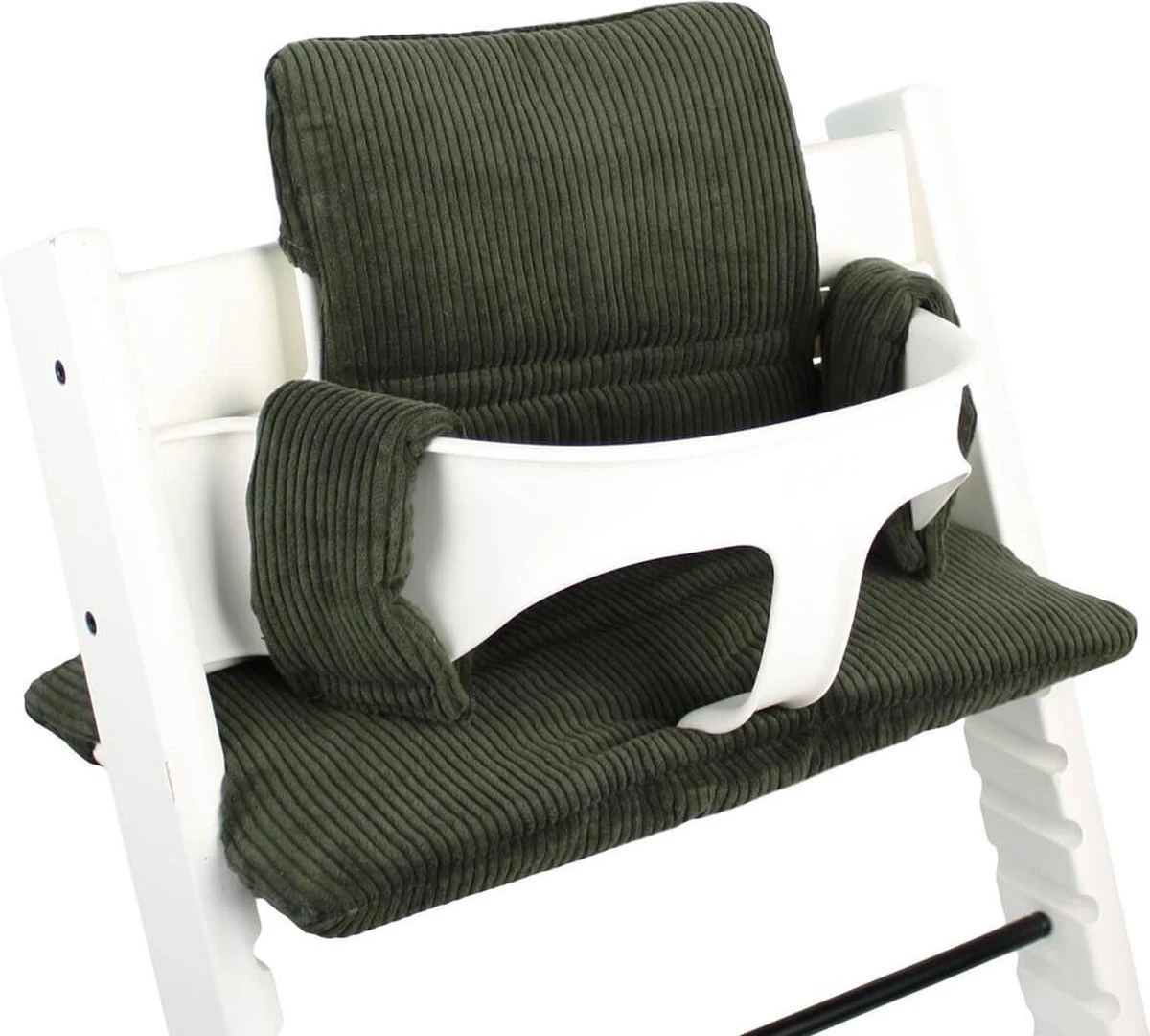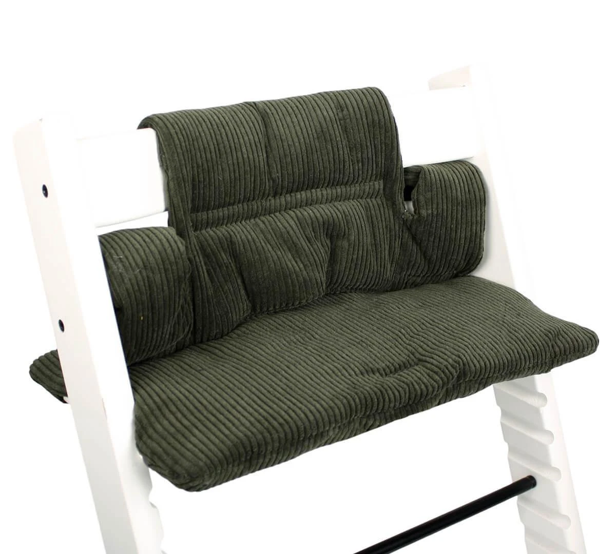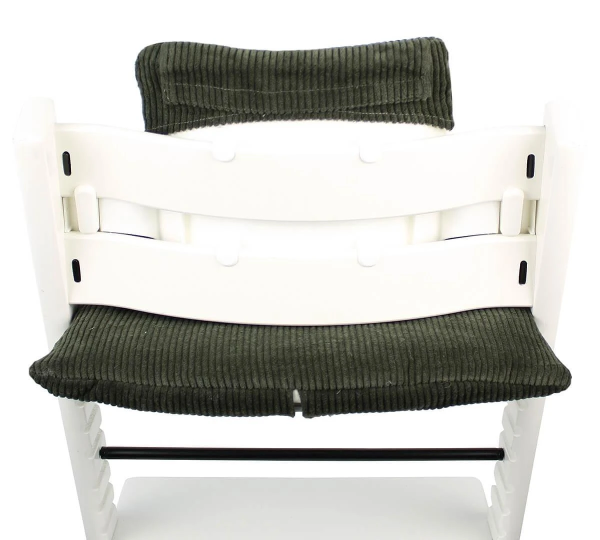 Zet je babyset (de plastic set of de houten set) op je TrippTrapp. Schuif het rugkussen over de babyset. Open de klittenbandjes van het zitkussen. Schuif de voorkant van het zitkussen over de stoel. Trek de achterkant voorzichtig over de stoel en sluit het klittenband. Is je kussenset vies geworden? Even wassen op 30 graden.